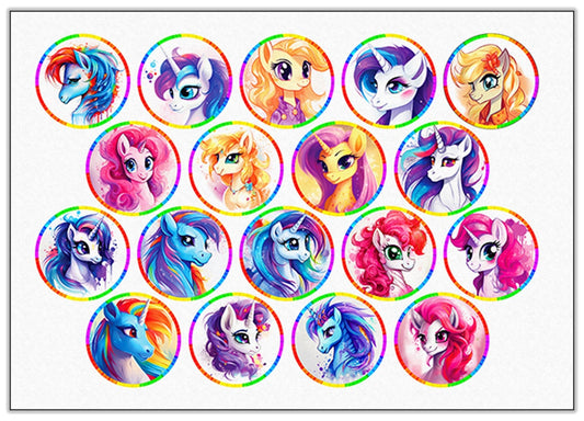 18 Pony Unicorns Edible Cupcake Toppers - Choose from Wafer Paper, Sugar Sheet, or Chocotransfer with No Cutting Required