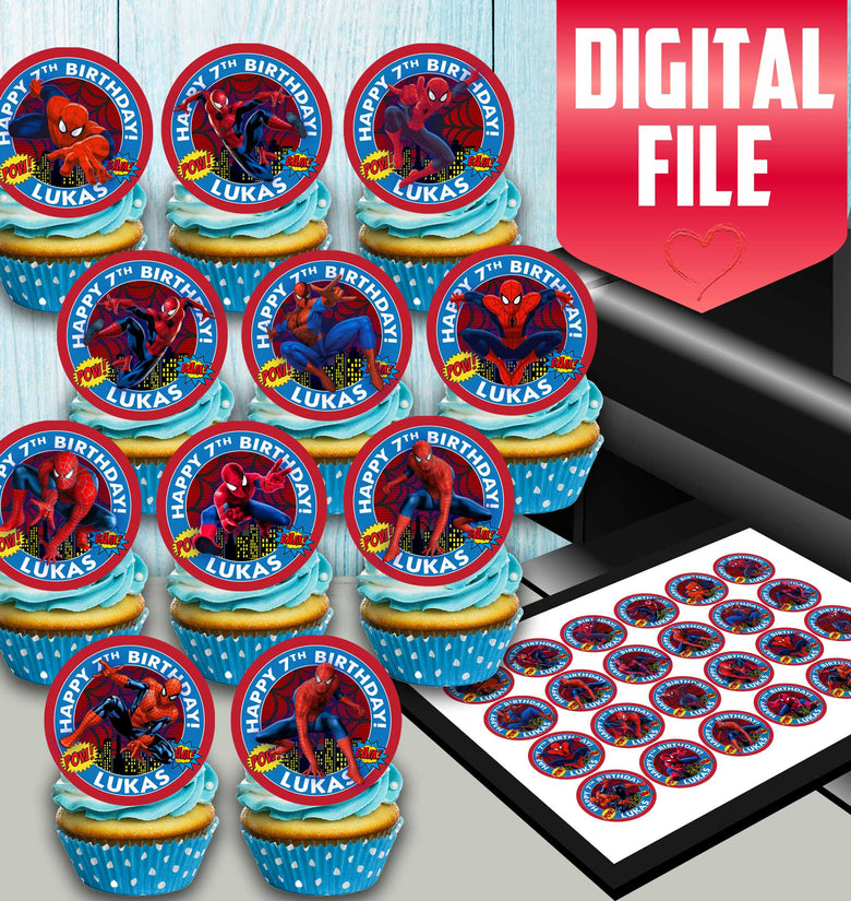 Edible Spider Man cupcake toppers with personalization 24 ready-made pieces - on waffle paper, sugar sheet or no-cut Chocotransfer