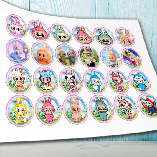 24 Labubu Edible Cupcake Toppers – Precut on Wafer Paper, Sugar Sheet, or Uncut Chocotransfer