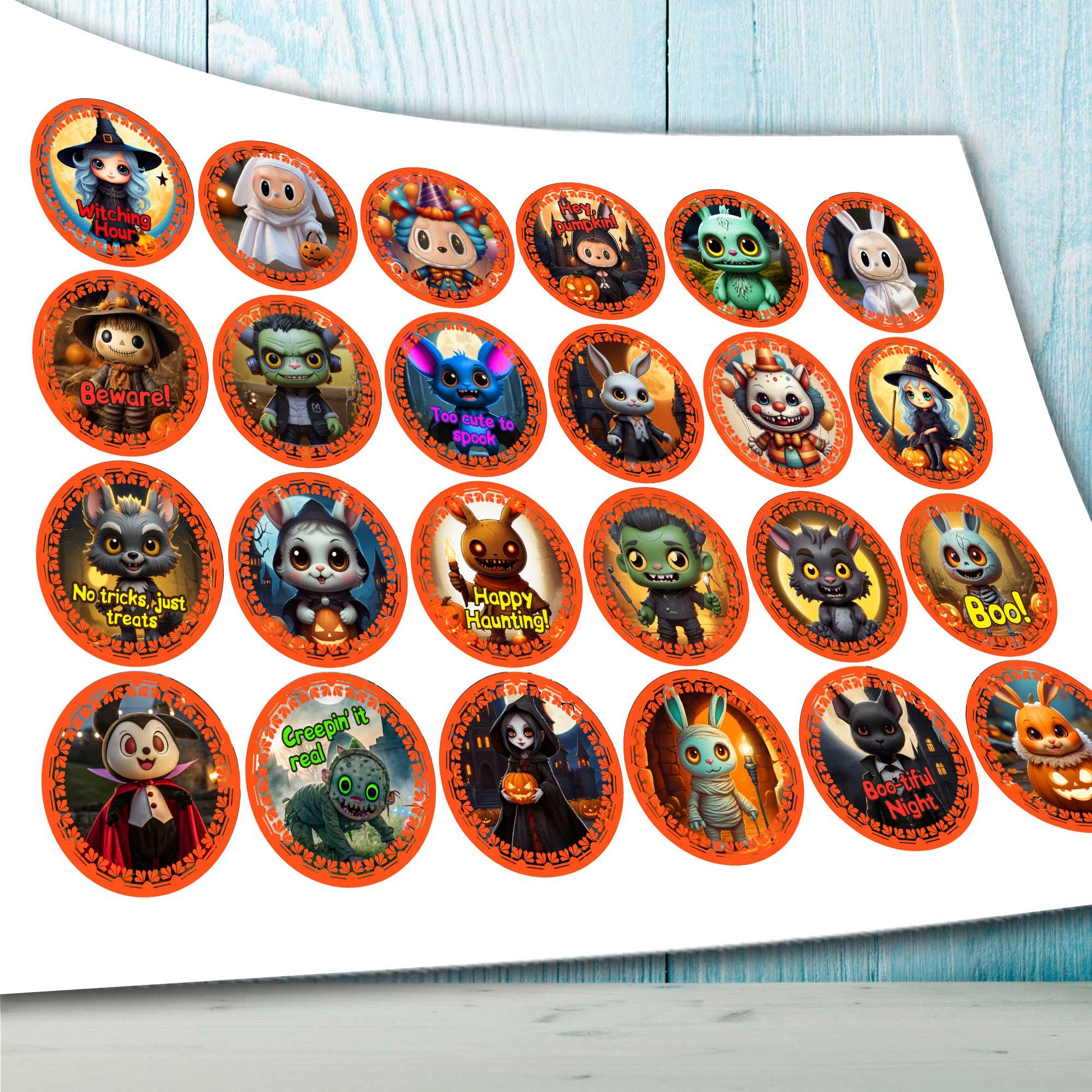 24 jedlých ozdob na halloweenské muffiny – roztomilé strašidelné postavičky, duchové, čarodějnice – předřezané na oplatkovém papíru, cukrovém plátu nebo neřezané čokoládové oplatce