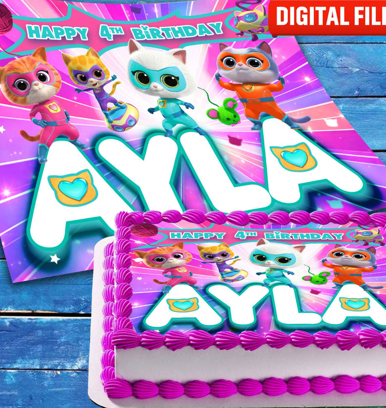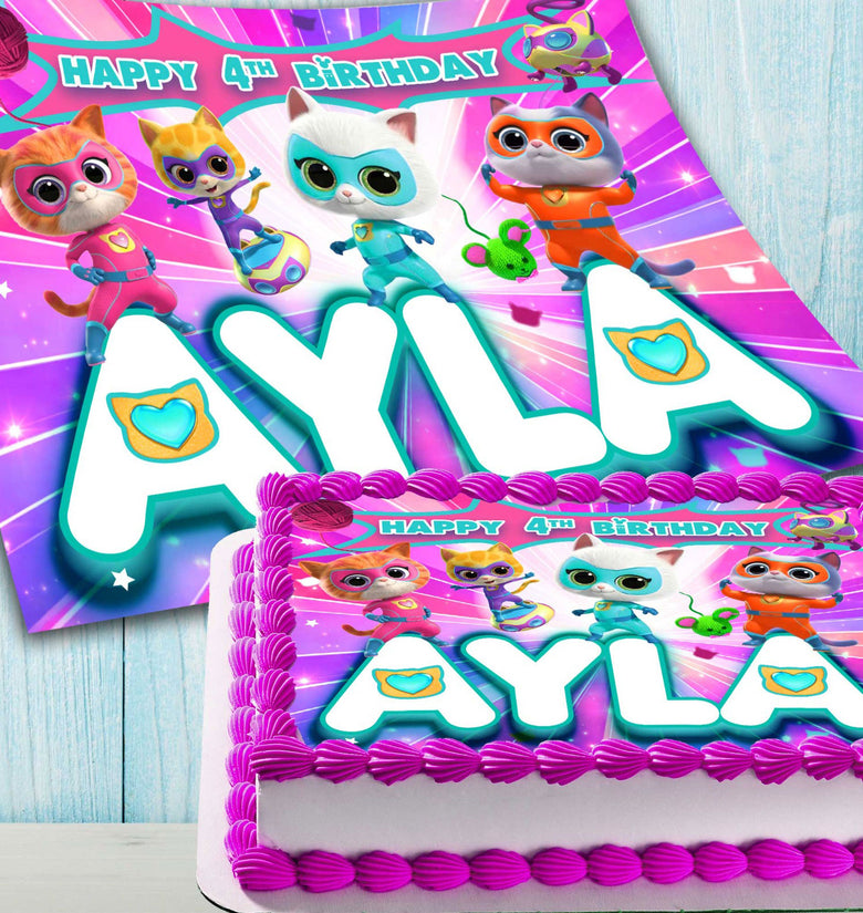 Stürzen Sie sich ins Geschehen mit diesem leuchtenden Katzen-Superhelden-Tortenaufleger! Mit einem auffälligen, von Ghost-Spider inspirierten Design ist dieses personalisierte essbare Bild das perfekte Herzstück für die Geburtstagsfeier Ihres Kindes.