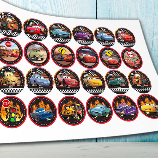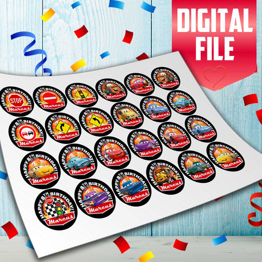 Edible Lightning McQueen Cars cupcake toppers with personalization 24 ready-made pieces - on waffle paper, sugar sheet or no-cut Chocotransfer