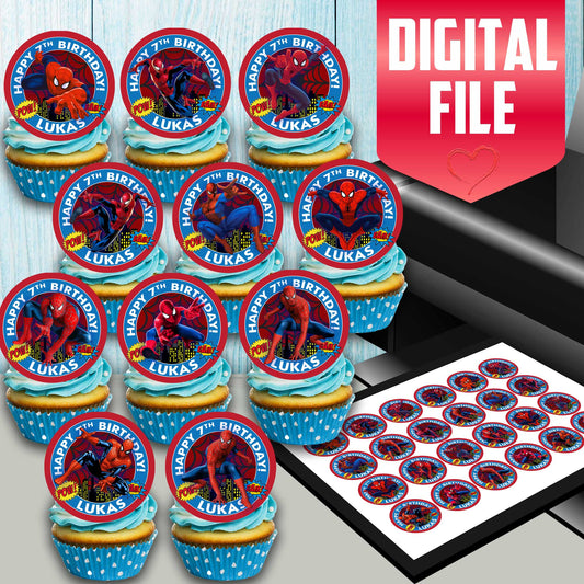 Edible Spider Man cupcake toppers with personalization 24 ready-made pieces - on waffle paper, sugar sheet or no-cut Chocotransfer