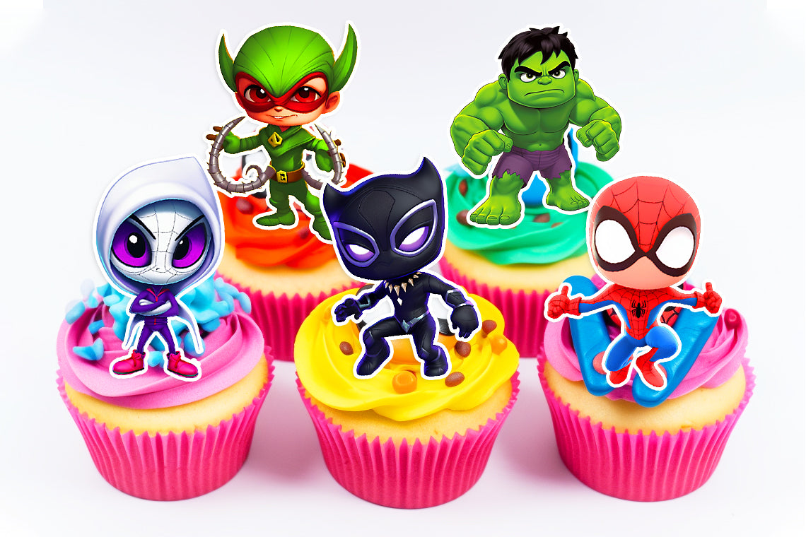 15 Superheros Edible Cupcake Toppers - Choose from Wafer Paper, Sugar Sheet, or Chocotransfer with No Cutting Required
