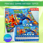 Editable gaming birthday cake topper with colorful game controller and pixel city background, personalized name and age, kids party cake design
