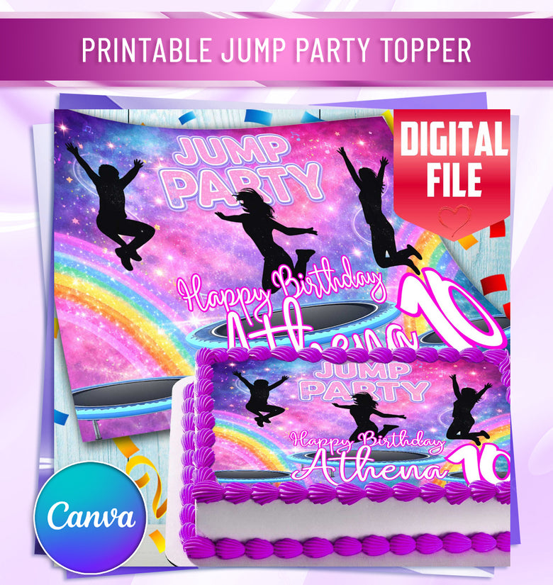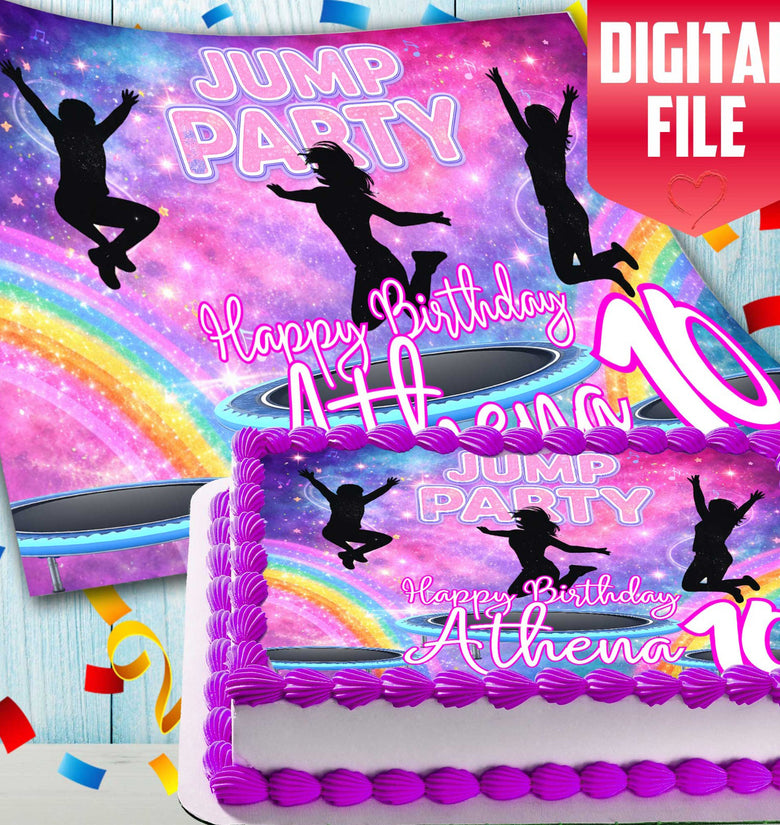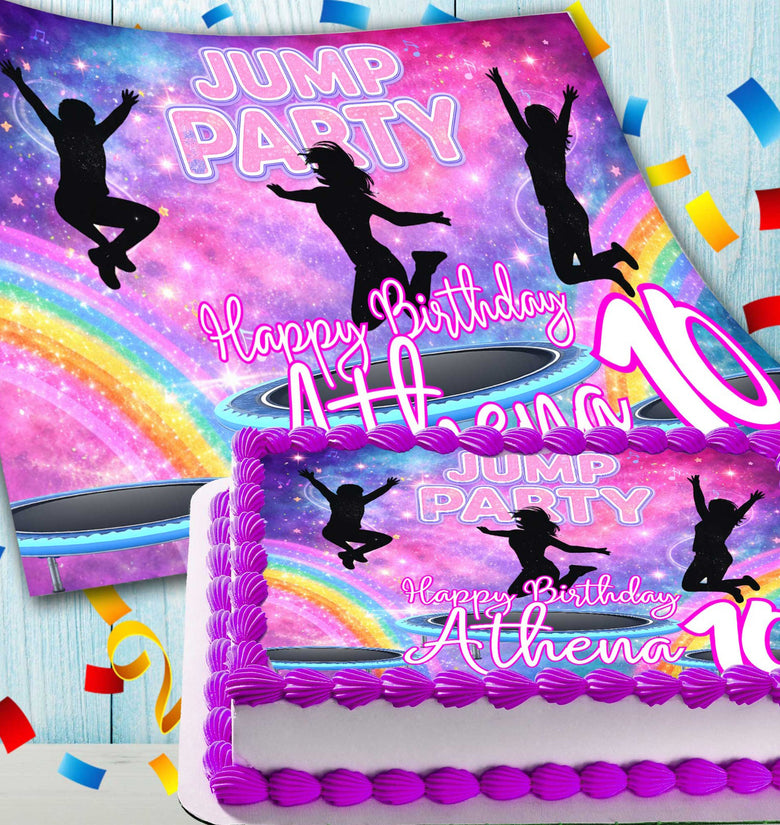 Make your child’s birthday extra fun with this vibrant Jump Party edible cake topper, designed especially for trampoline and jump-party celebrations. Featuring energetic silhouettes, a colorful galaxy background, and a playful rainbow vibe, this topper turns any cake into a show-stopping centerpiece for an active birthday party.