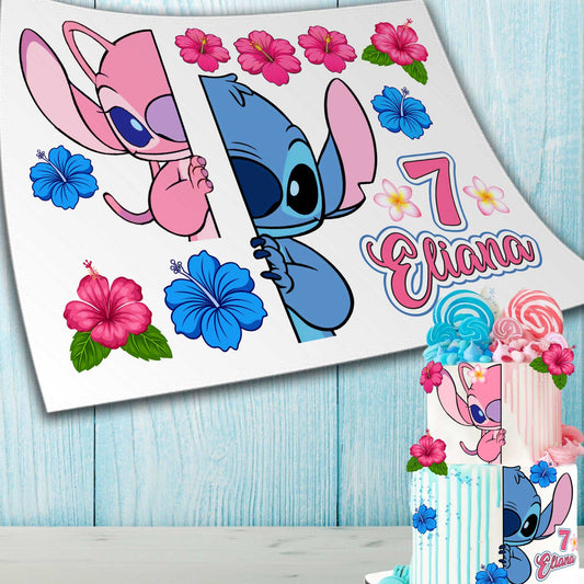 Stitch and Angel Birthday Themed Edible Cake Topper - Rectangular Design - Wafer Paper, Sugar Sheet, Chocotransfer