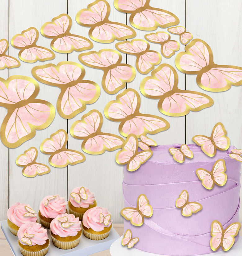Transform your cake into a magical centerpiece with these delicate pink and gold butterfly edible toppers! 🦋