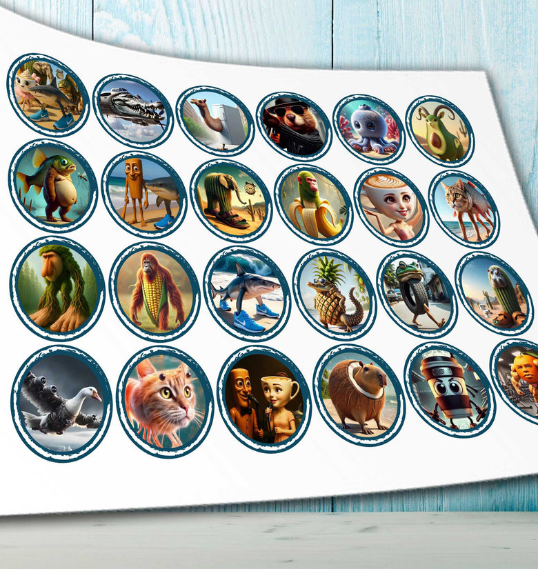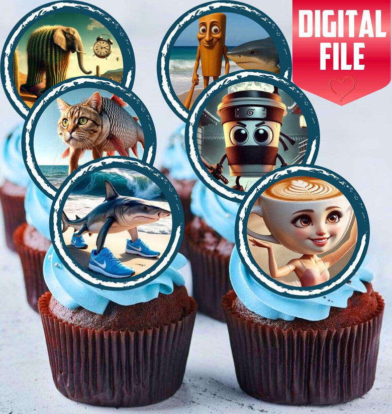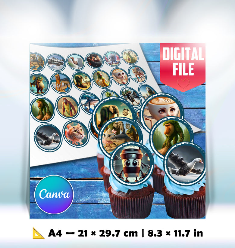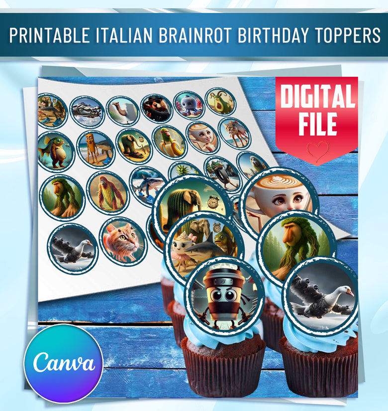 This set includes 24 round Italian_brainrot-themed images on an A4 size (8.3" × 11.7") sheet. Each circle is approx. 1.5 inches in diameter – perfect for cupcake toppers, stickers, labels, or any DIY party project! 🎉