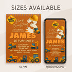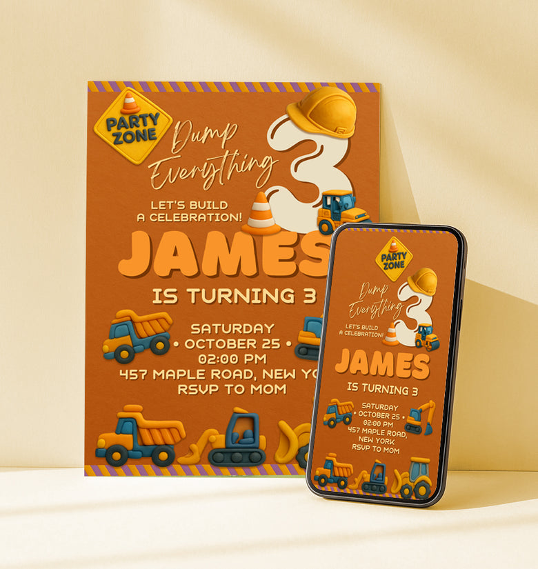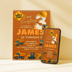 Construction birthday invitation template in clay style with trucks, excavator and hard hat — printable 5x7 design and mobile version.