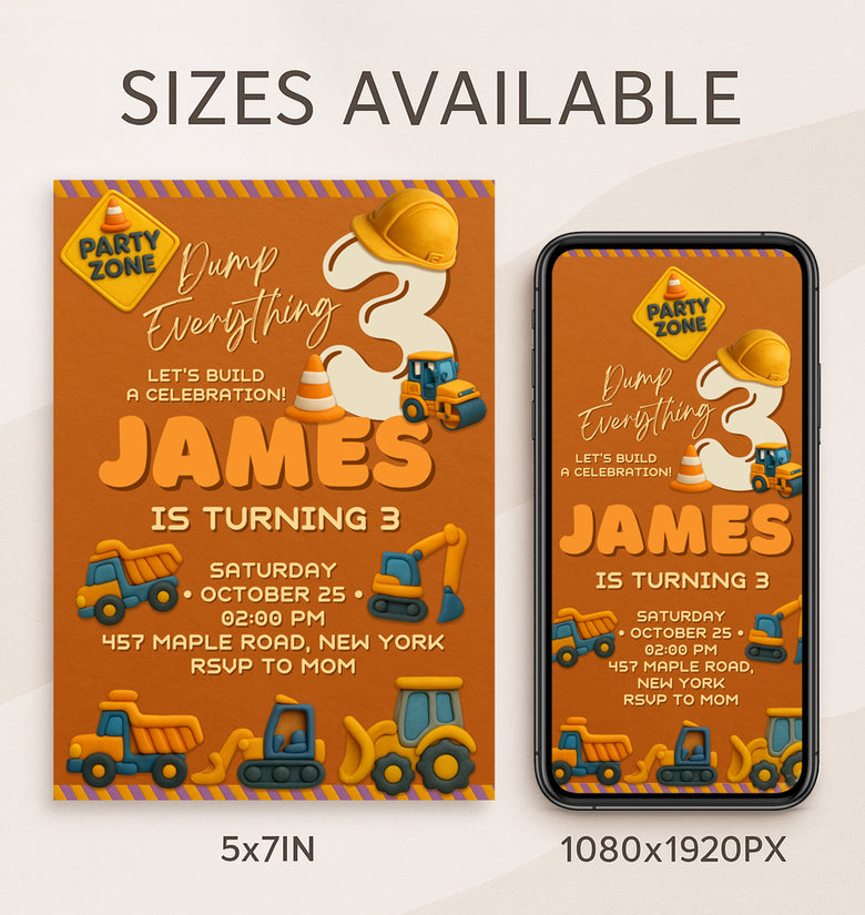 Editable construction-themed birthday invitation template in a clay art style. Perfect for kids’ birthday parties. Fully editable in Canva and delivered as an instant digital download. No physical item will be shipped.