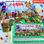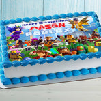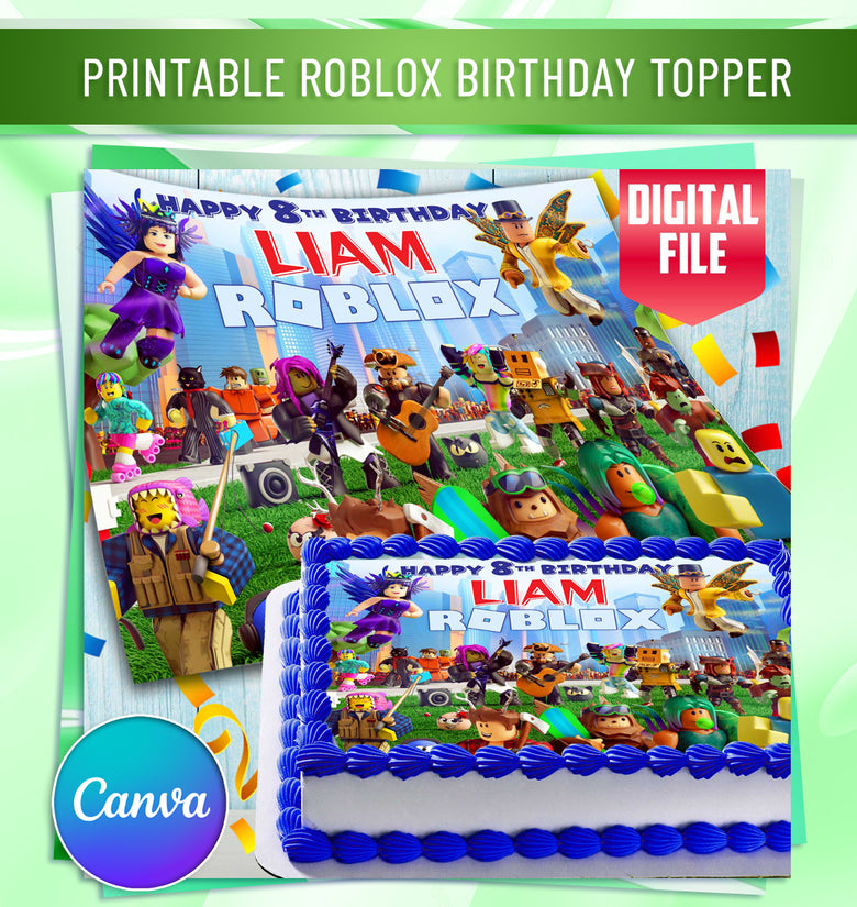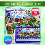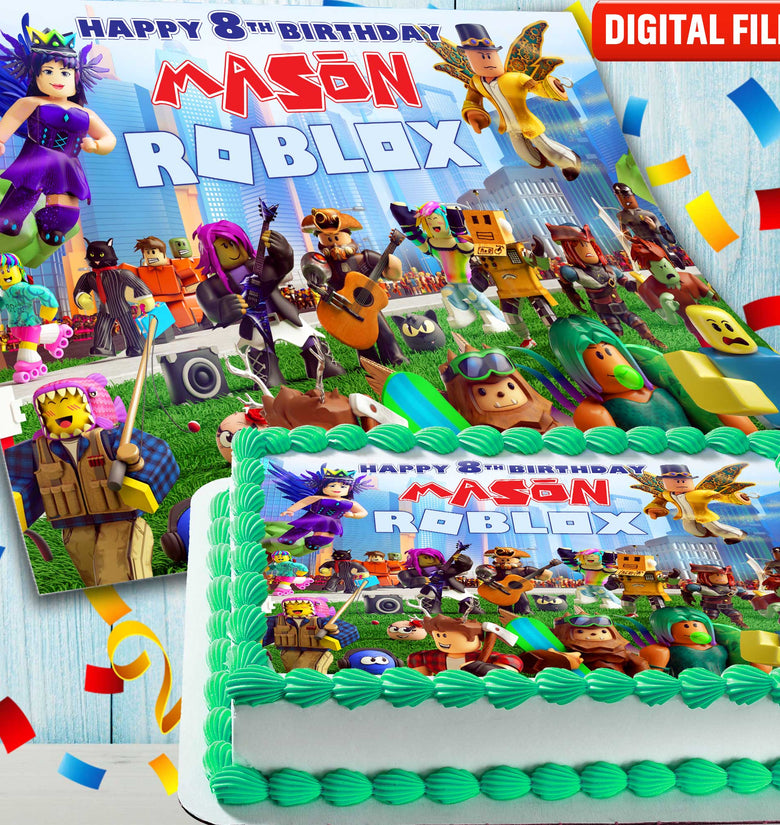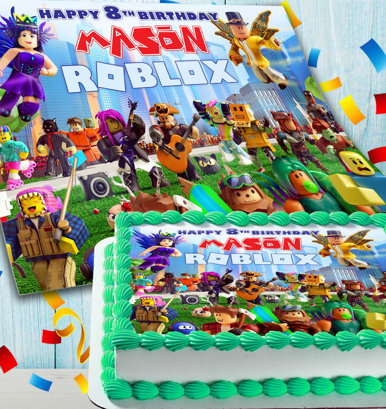 Personalized Roblox birthday cake topper for gamer-themed celebrations. Printed with food-grade inks on wafer paper, sugar sheet, or chocotransfer. Custom name and age available.