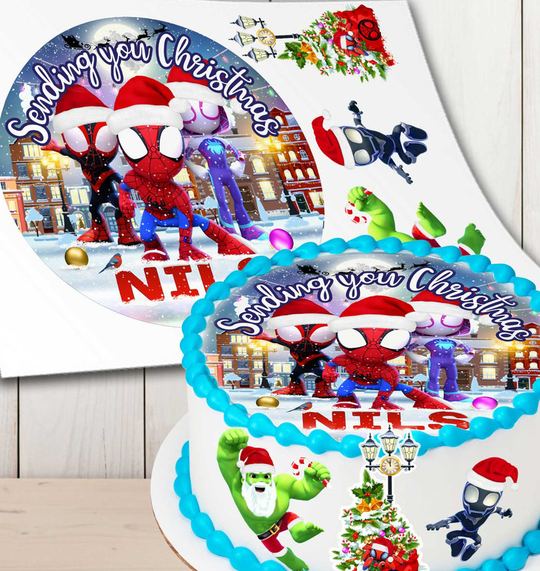 Add a festive touch to your cake with these premium Spidey-themed Christmas edible toppers. Each image is precut, easy to use, and printed in bright colors to make your holiday cake stand out.