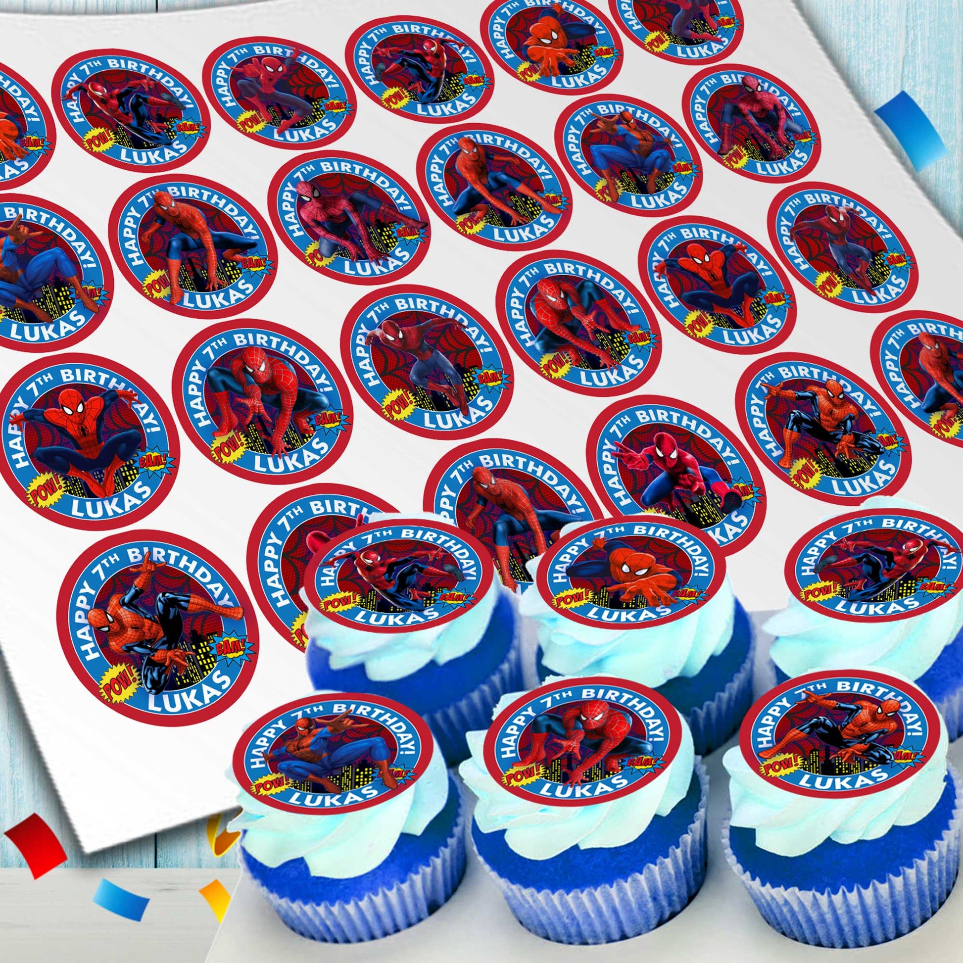 Edible Spider Man cupcake toppers with personalization 24 ready-made pieces - on waffle paper, sugar sheet or no-cut Chocotransfer