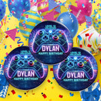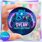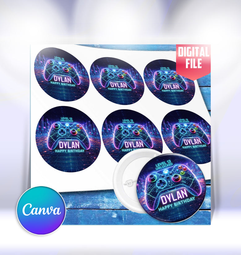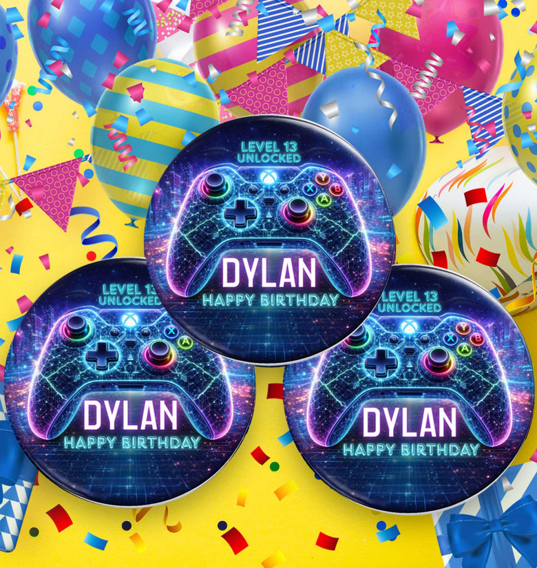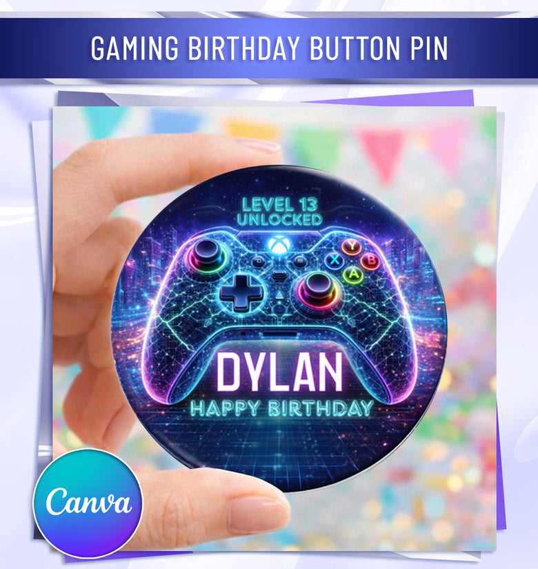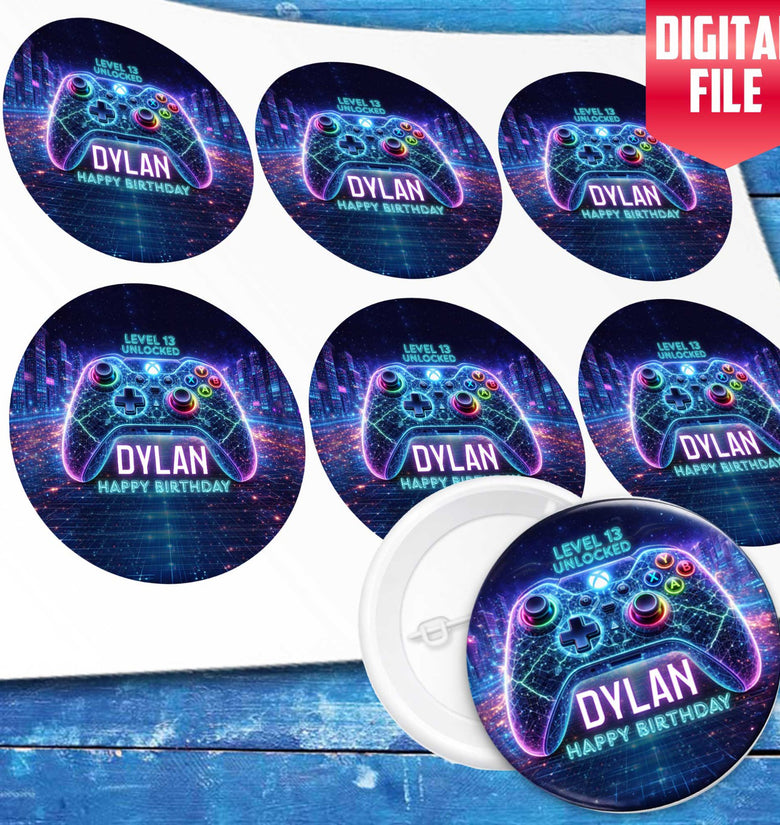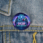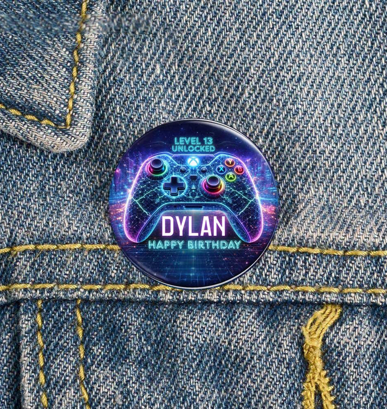 Personalized gamer birthday button pin featuring a neon “Level Unlocked” gaming controller design inspired by classic game themes. Customizable with name and age, this party badge is perfect for gaming-themed birthdays, party favors, and celebration outfits.
