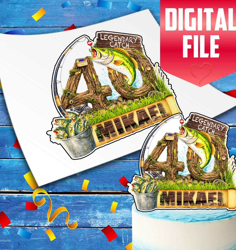 Make their birthday legendary with this “Legendary Catch” fishing cake topper.Featuring a rustic wood-style number, detailed bass illustration, fishing rod accents and a persona...