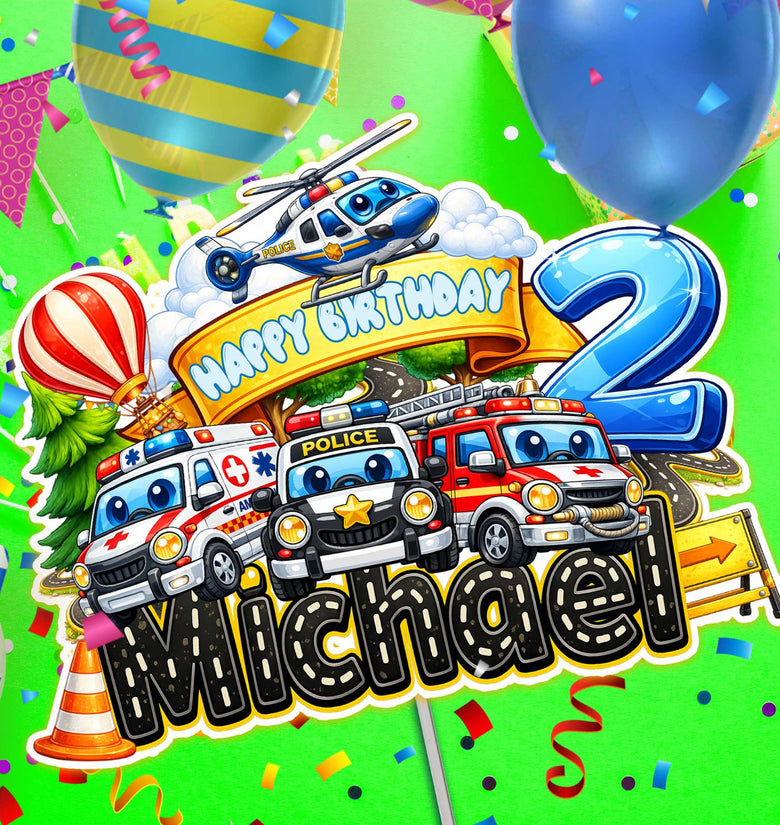 Make your little one’s birthday extra joyful with this colorful kids vehicles cake topper, featuring friendly police car, fire truck, ambulance, and helicopter characters. Personalized with name and age.
