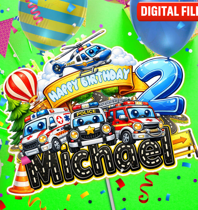 Make your little one’s birthday extra joyful with this colorful kids vehicles cake topper, featuring friendly police car, fire truck, ambulance, and helicopter characters. Perso...