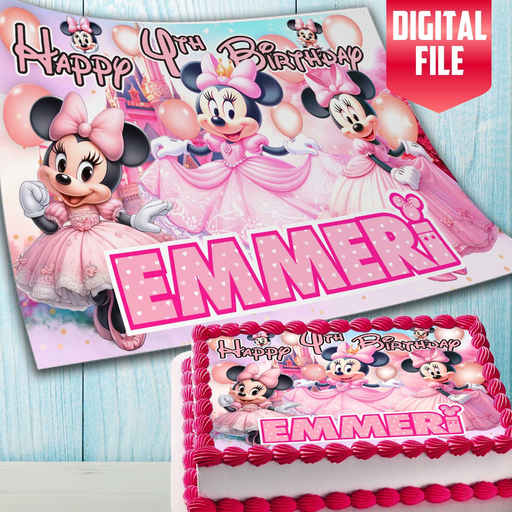 Minnie Mouse Birthday Themed Edible Cake Topper - Rectangular Design - Wafer Paper, Sugar Sheet, Chocotransfer