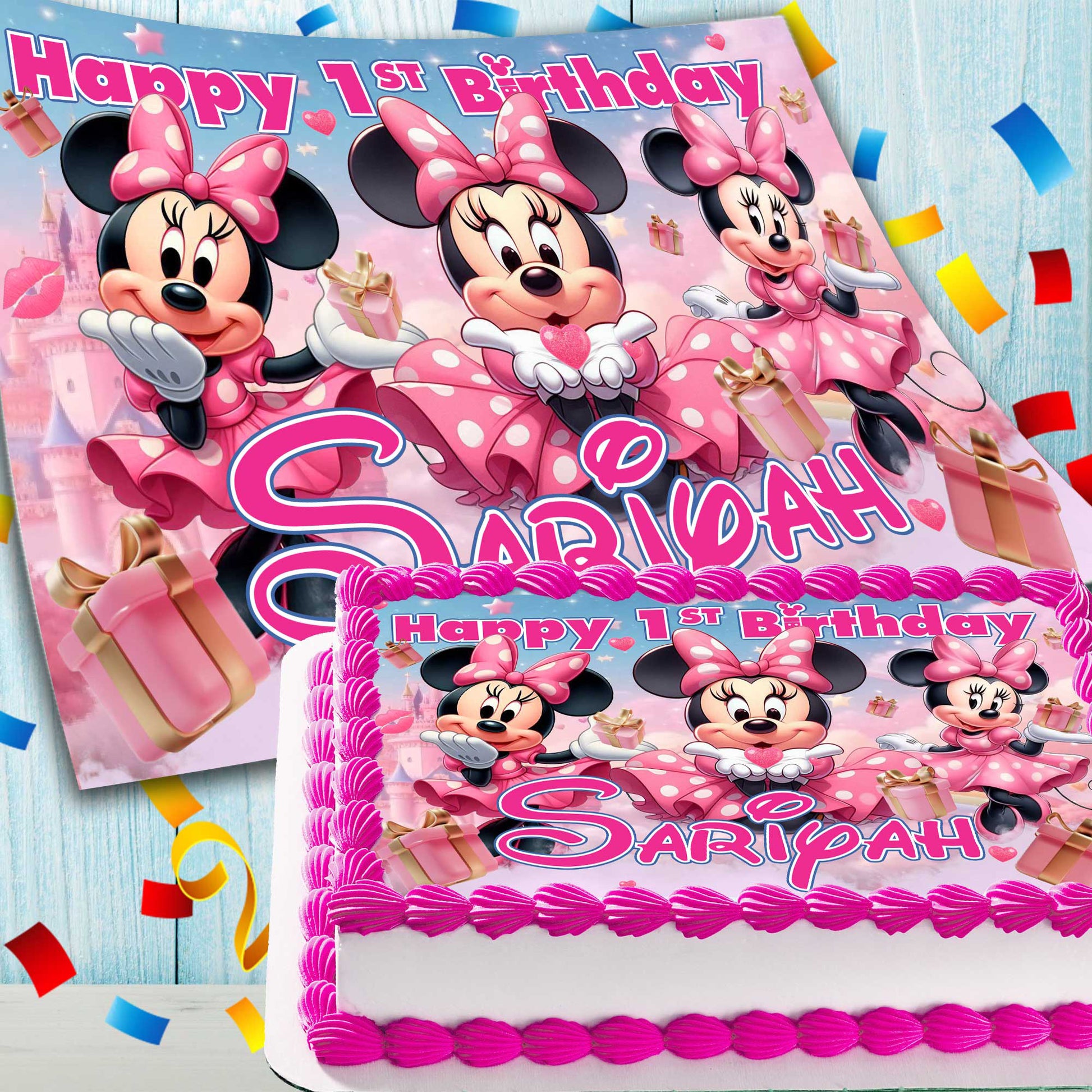 Minnie Mouse Birthday Themed Edible Cake Topper - Rectangular Design - Wafer Paper, Sugar Sheet, Chocotransfer