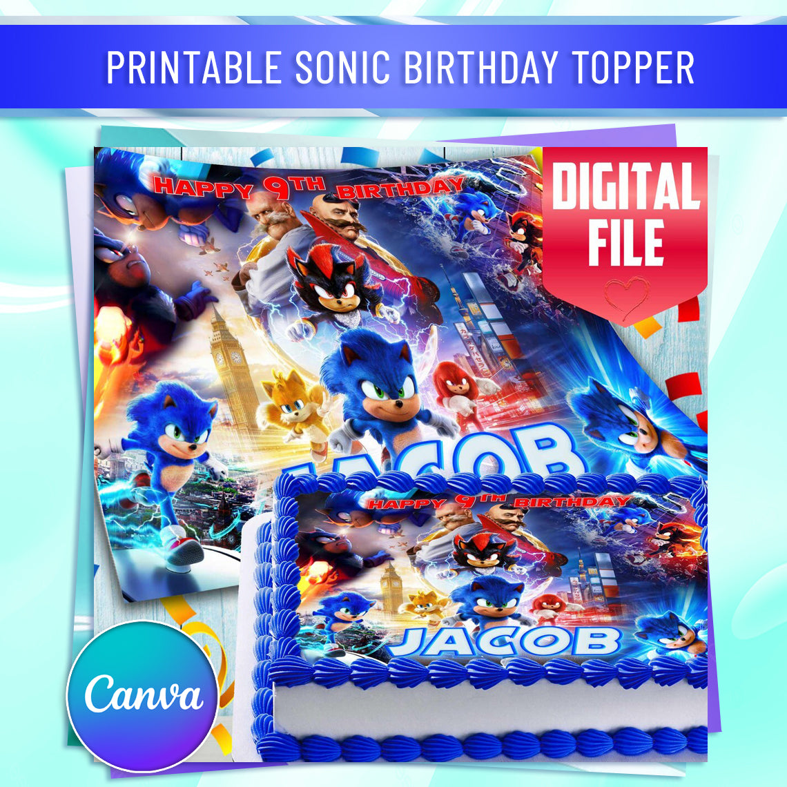 Sonic Birthday Themed Edible Cake Topper - Rectangular Design - Wafer Paper, Sugar Sheet, Chocotransfer