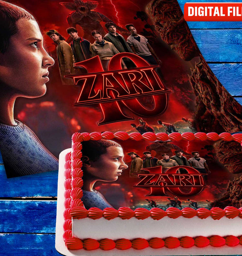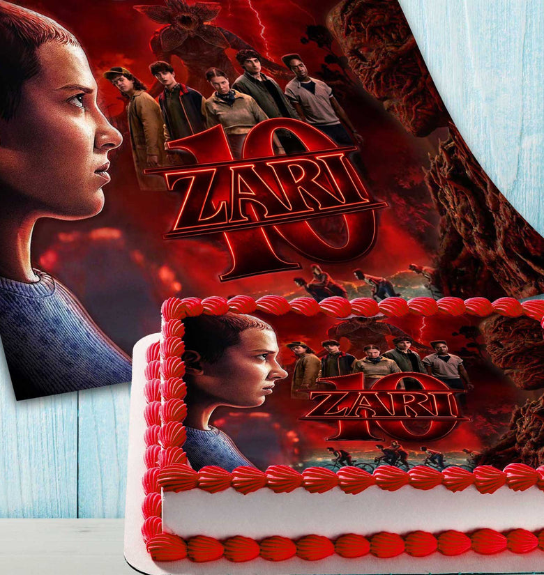 Bring the world of Stranger Things to your celebration with this personalized edible cake image. Featuring a dramatic design inspired by the iconic series and the mysterious Upside Down atmosphere, this cake topper instantly transforms any birthday cake into a striking centerpiece for fans of the show.