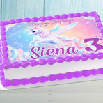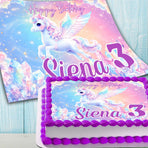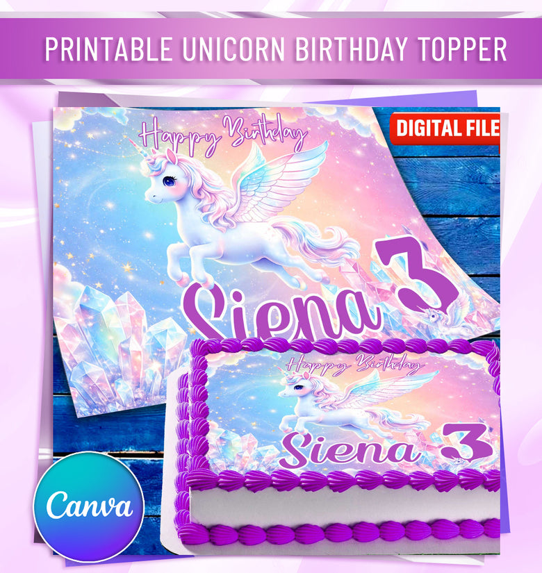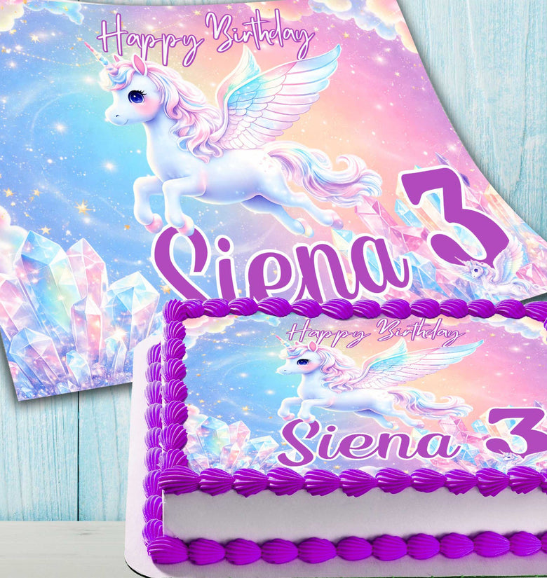 Make your child’s birthday extra special with this personalized unicorn birthday cake topper featuring soft pastel colors and crystal details. This edible image features a flying unicorn design with soft pastel colors and crystal details, customized with your child’s name and age to match a magical birthday theme.