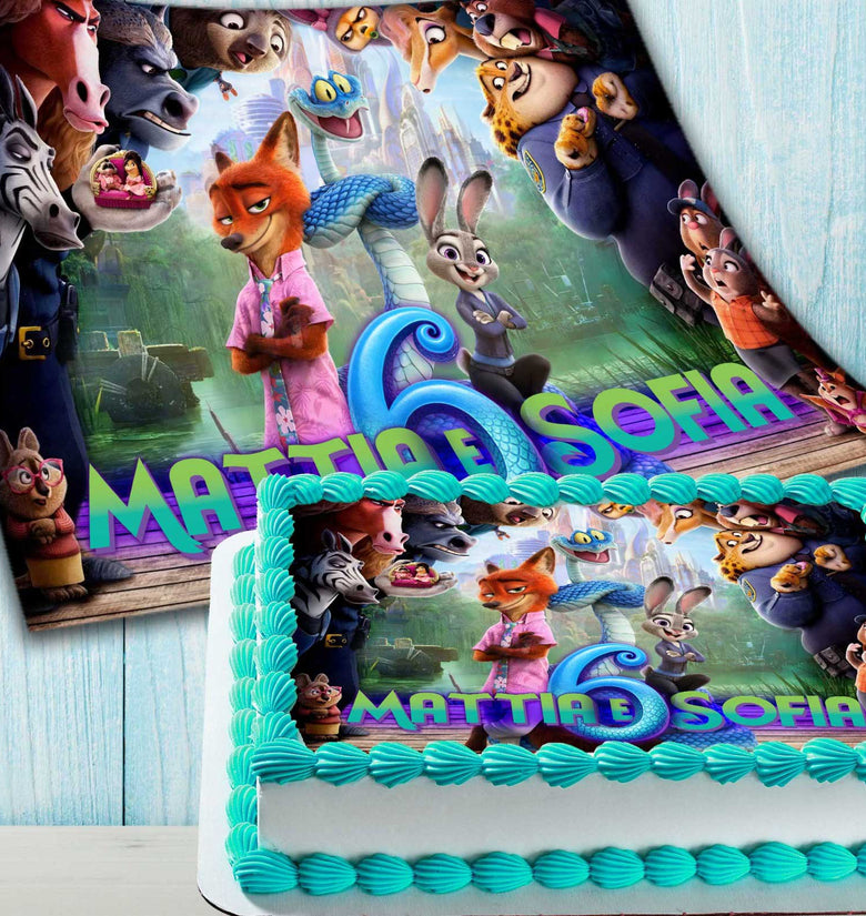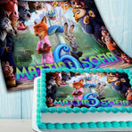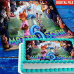 Zootopia birthday cake topper featuring popular characters like Judy Hopps, Nick Wilde and their friends. Personalized edible cake image with name and age, perfect for kids birthday cakes and Zootopia themed parties.
